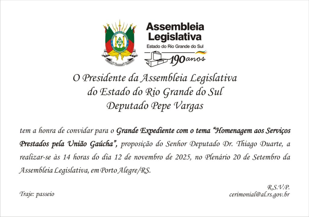 __________________________________________________________ 🗞 SUGESTÃO DE PAUTA / SERVIÇO Evento: Grande Expediente – Homenagem aos 20 anos da União Gaúcha em Defesa da Previdência Social e PúblicaTema: “Homenagem aos Serviços Prestados pela União Gaúcha”Propositor: Deputado Dr. Thiago Duarte (União Brasil)Data: 12 de novembro de 2025 (quarta-feira)Horário: 14hLocal: Plenário 20 de Setembro – Assembleia Legislativa do Estado do