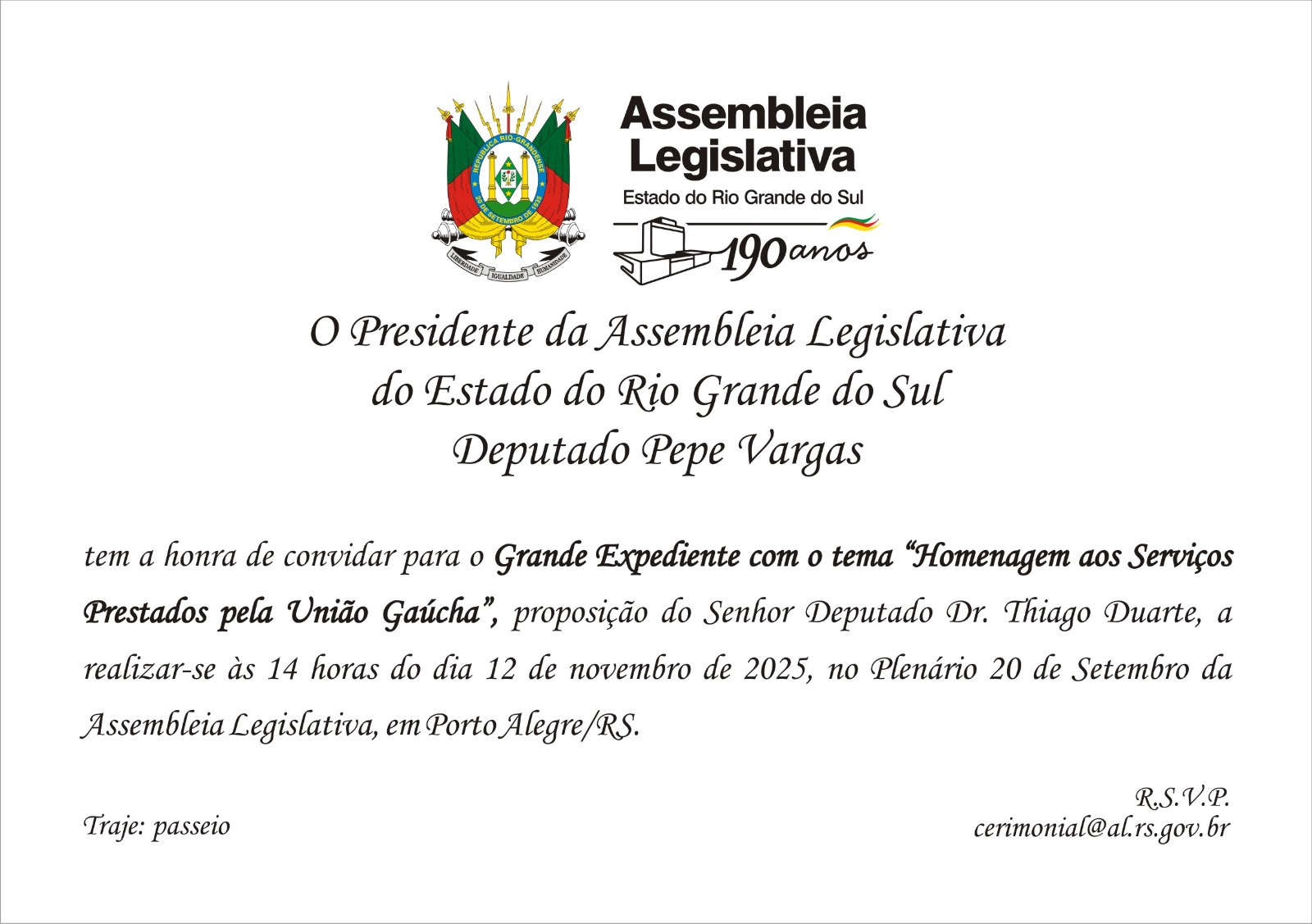 Leia mais__________________________________________________________ 🗞 SUGESTÃO DE PAUTA / SERVIÇO Evento: Grande Expediente – Homenagem aos 20 anos da União Gaúcha em Defesa da Previdência Social e PúblicaTema: “Homenagem aos Serviços Prestados pela União Gaúcha”Propositor: Deputado Dr. Thiago Duarte (União Brasil)Data: 12 de novembro de 2025 (quarta-feira)Horário: 14hLocal: Plenário 20 de Setembro – Assembleia Legislativa do Estado do Rio Grande